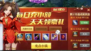 内容:开服每日获得充值元宝即可获取超值大礼,每当奖励只能领取一次哦。