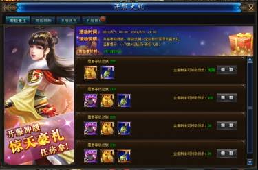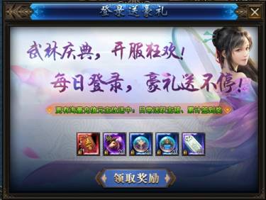 内容:开服每天登陆游戏即可获得极品奖励,当天达到指定的目标,还可领取奖励!
