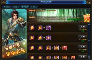 内容:活动期间,野外挂机击杀小怪,即可掉落开、服、狂、欢、礼等各种文字道具,收集道具即可兑换奖励,活动结束后道具过期无法使用!