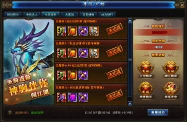 内容:开服第三天,坐骑进阶排行!坐骑等级根据当天23点天服务器记录等级为准,进行排行,请提前1小时候冲榜,排行奖励通过邮件发送,仅可获得符合条件的最高档次的奖励!